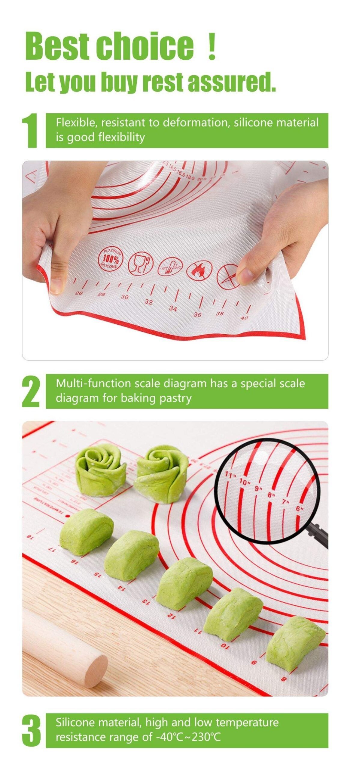 Made from high-quality food-grade silicone, the mat provides a non-stick surface that prevents dough and pastry from sticking. It is heat-resistant, flexible, and easy to clean, making it ideal for everyday kitchen use.